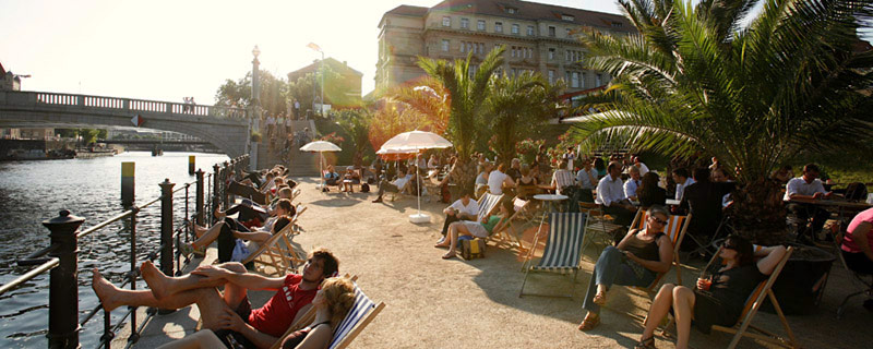 Идеална локација за кулирање во летните ноќи, директно на реката Шпрее. Лежалки, песок, палми, поглед на музеите, кои се наредени еден до друг на таканаречениот остров на музеи. Во заднина се слуша музиче и чекори во ритамот на танго, салса, чачача или, пак, гласови на глумците што играат класични театарски претстави под отворено небо во театарот „Monbijou“. Лабава атмосфера среде град, под јасното сино небо на Берлин.