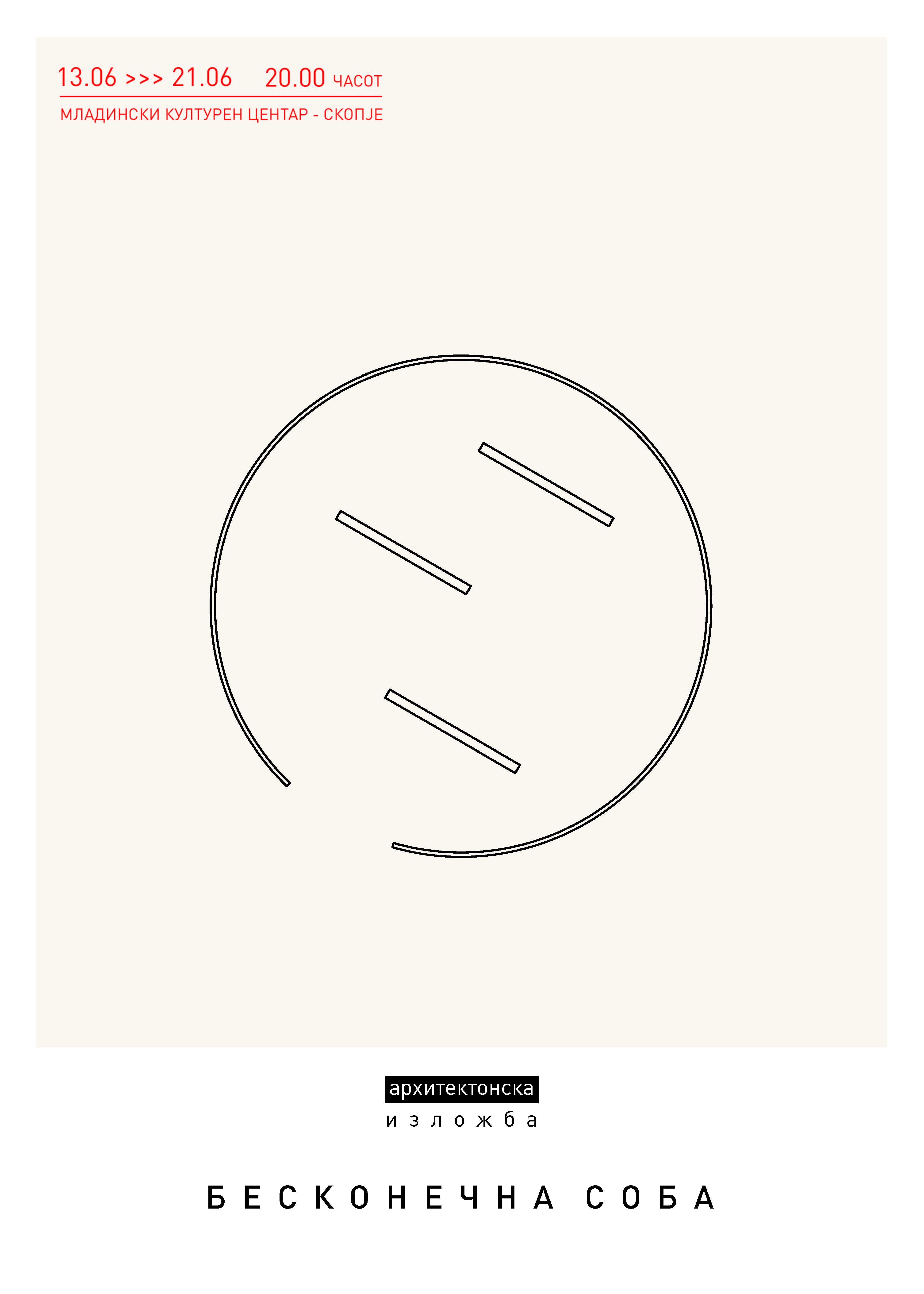 На 13.06.2018 година (среда), со почеток во 20:00 часот, во Младинскиот Културен Центар во Скопје, ќе се отвори архитектонската изложба под наслов „Бесконечна соба“. На изложбата се претставени пет архитектонски проекти пријавени на меѓународни конкурси во Скопје, Варна и Загреб, работени во периодот помеѓу 2013 и 2018 година.