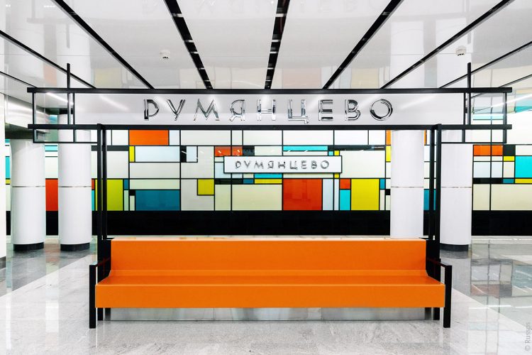 Метро-станицата Румјанцево во Москва, отворена во јануари 2016, ги има на себе композициите на Мондријан.