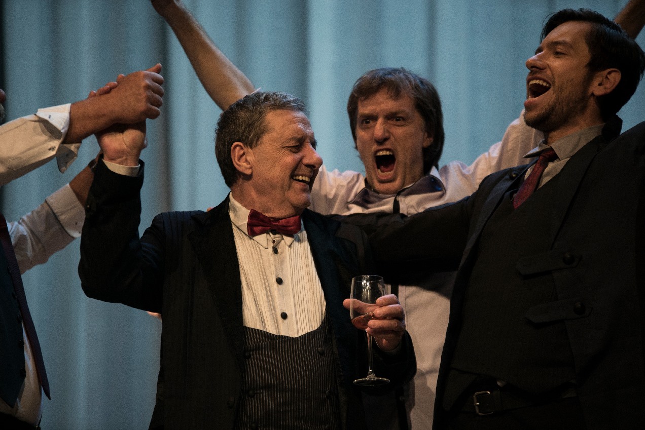 Јас се извинувам, ама намерно нема да зборувам за приказната и за нејзината содржина и да ја објаснувам макар и накратко. Прво, на многу луѓе им е позната па е излишно, а второ, за оние што не ја знаат оваа претстава е супер можност сами да го доживеат чувството кога ги откриваат деталите. Претставата во Драмски театар тоа им го доловува на еден одличен, одличен начин. Можам само да кажам дека темите што ја прават суштината на „Фестен“ се злоупотребата, траумите, нивните рефлексии, гнилата и болна ароганција на данската аристократија и буржоазија, расизмот, фашизмот, себезаљубеноста, површноста и вештачкиот сјај на фамилијарните и пријателските односи итн. И просто да не знаеш за кој актер да почнеш да коментираш зашто секој од кастот е толку точен, уверлив, многу веродостоен и прецизен во изведбата. Диме Илиев мирно, нетипично наметлив, авторитетен и полн несигурности, просто автентичен како ликот Хелге. Александар Степанулески како Кристијан е издржан во секој гест, одмерен и моќно таинствен, налудничаво загубен во траумата, но и стабилен, со цврста волја да разоткрие еден грозоморен проблем и да оконча долгогодишен, лицемерен, болен молк. Тамара Ристеска – Пија носи свежина, ведрина, љубовна суптилност и едноставност во актерската игра, која покажува многу. Енергијата што му ја дава на својот лик не постои во филмот и воопшто таа навистина додава важни сегменти, емоции на она што е генерално испишано за Пија само преку реплики во драмата. Дејан Лилиќ како Михаел создава една навистина своја верзија на ликот со ексцесивни реакции, жесток темперамент, многу живост што се движи од инфантилна избувливост до интуитивност, цинизам, цврст интелект. Навистина живописна изведба на Лилиќ. Емилија Мицевска која ја игра Мете, е уверливо калкулативна, отсечна, многу фокусирана на самиот менталитет на ликот, лесно ве иритира, но и брзо станува симпатична. Елзе, преку изведбата на Лилјана Велјанова, многу вистинито дава слика за една ментално придушена жена, просто човек што го премолчил непремолчливото и се изгубил во маската што крие многу внатрешен немир. Хелене, во изведба на одличната Соња Стамболџиоска, молскавично брзо ја читаме, навидум налудничав, но всушност потресен, топол, слободоумен, лојален, доверлив и хуман карактер. Дениз Абдула, како Гбатокаи, прикажува луцидно, остро веродостојно отсликување на ликот. Кај сè се чини како да е едноставно најдено како решение за гест и реакција, но гледаме дека токму во тоа се содржат и потслоеви. Убав е и природниот ненападен хумор што го носи во себе. Димитрија Доксевски го игра Хелмут во добро обмислена, точно стилизирана и грациозна визура. Промените што ги доживува ликот, од формалност и куртоазност, достоинство и почит до бессознание, темелна вознемиреност, паника и бунило, Димитрија ги прави многу верно како нераздвоен дел од „вистината“ на приказна т.е. од самата приказна. И јасно, убавина и среќа е да се гледа младата девојка Анастасија Аневска, која многу интуитивно го игра Девојчето, но и духот на сестрата на Кристијан, Михаел и Хелене. Рамо до рамо со професионалците, сериозно, допадливо, без сигнал за скромност или непријатност на сцената. Лазе Манасковски како Поул остварува толку специфична улога, тој владее со особините на ликот. Вешто се движи во неговиот спектар на карактеристи