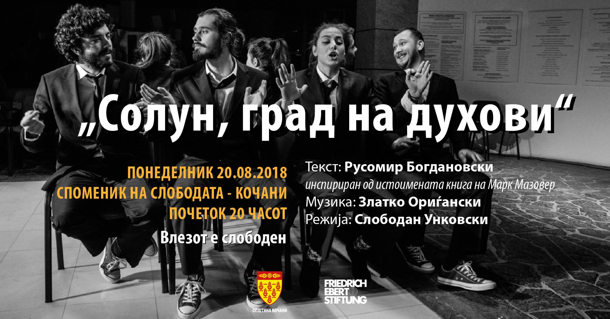 „Солун, град на духови – христијани, муслимани и Евреи 1430 – 1950“ е возбудлива документарно-играна драма, развиена од Русомир Богдановски на основа на хрониката на познатиот историчар и професор Марк Мазовер, за животот и случувањата во градот Солун, во периодот од турското освојување во 1430 година па сè до Холокаустот и депортацијата на 45.000 солунски Еврeи во логорот Аушвиц. На 20.08.2018, оваа претстава во продукција на „Театарот на Навигаторот Цветко“ од Скопје, во режија на Слободан Унковски и со оригинална музика на Златко Ориѓански, за првпат ќе биде изиграна на Споменикот на слободата во Кочани.